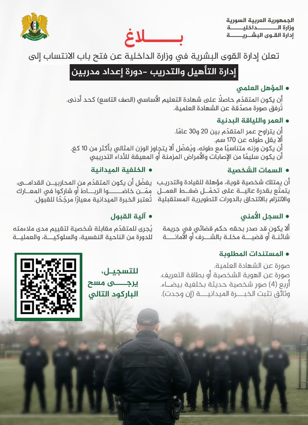 بلاغ من وزارة الداخلية السورية: فتح باب الانتساب إلى إدارة التدريب والتأهيل - دورة إعداد المدربين (TOT)