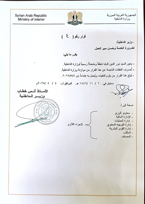 قرار وزير الداخلية رقم 4: تعيين نور الدين البابا ناطقاً رسمياً باسم الوزارة