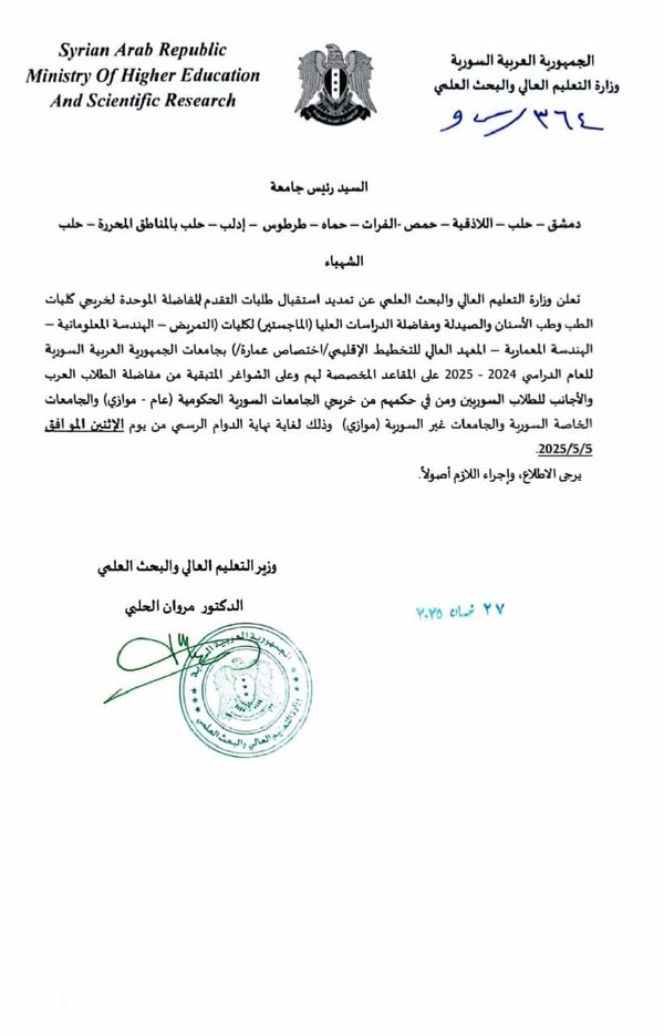 تعلن وزارة التعليم العالي والبحث العلمي عن تمديد استقبال طلبات التقدم للمفاضلة الموحدة لخريجي كليات الطب وطب الأسنان والصيدلة ومفاضلة الدراسات العليا (الماجستير) لكليات التمريض - الهندسة المعلوماتية -الهندسة المعمارية - المعهد العالي للتخطيط الإقليمي / اختصاص عمارة بجامعات الجمهورية العربية السورية للعام الدراسي 2024 - 2025 على المقاعد المخصصة لهم وعلى الشواغر المتبقية من مفاضلة الطلاب العرب والأجانب للطلاب السوريين ومن في حكمهم من خريجي الجامعات السورية الحكومية عام - موازي) والجامعات الخاصة السورية والجامعات غير السورية (موازي) وذلك لغاية نهاية الدوام الرسمي من يوم الإثنين الموافق 2025/5/5