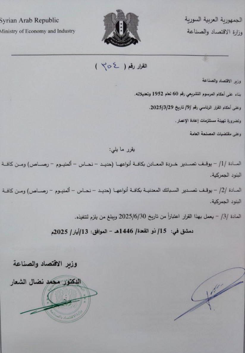 قرار وزارة الاقتصاد رقم 354 يقضي بتوقيف تصدير خردة المعادن والسبائك المعدنية بكافة أنواعها