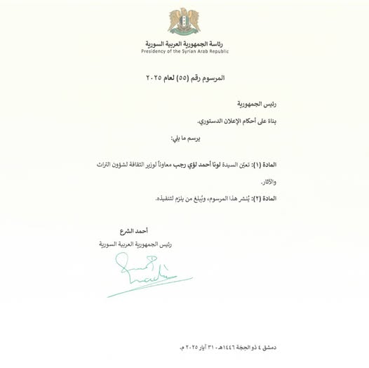 المرسوم 55 لعام 2025: تعيين السيدة لونا أحمد لؤي رجب معاونة لوزير الثقافة الشؤون التراث والآثار