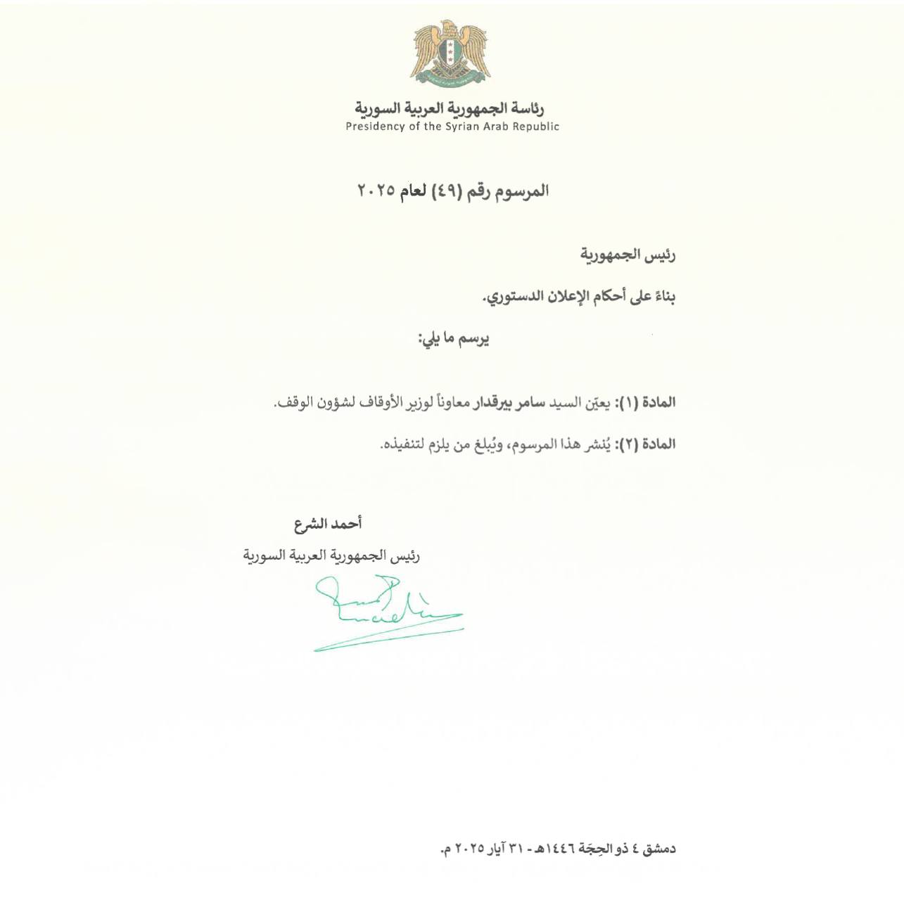 المرسوم 49 لعام 2025: تعيين السيد سامر بيرقدار معاوناً لوزير الأوقاف لشؤون الوقف
