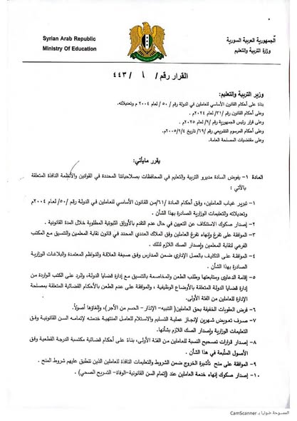 ٢٣- السماح للمدرسين الذين اتبعوا دورات لمدة تسعة أشهر في المعلوماتية بالسفر ضمن الأسس الوزارية المعتمدة مضي سنتين أو دفع الالتزامات المتبقية .