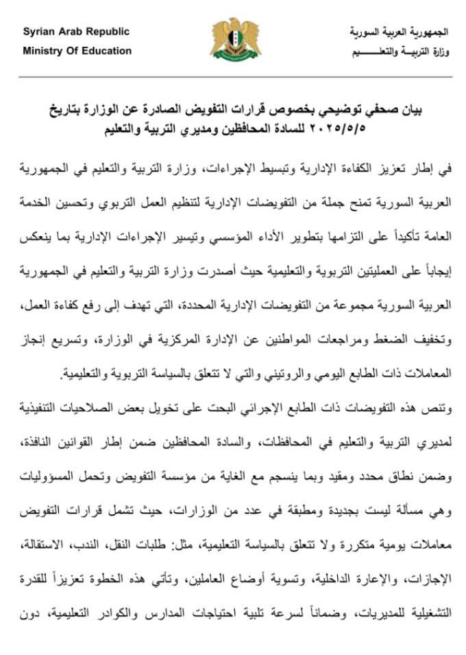 بيان صحفي توضيحي بخصوص قرارات التفويض الصادرة عن الوزارة بتاريخ ٢٠٢٥/٥/٥ للسادة المحافظين ومديري التربية والتعليم