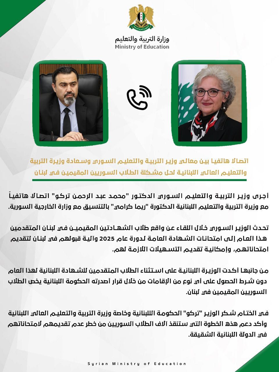 اتصالا هاتفيا بين معالي وزير التربية والتعليم السوري وسعادة وزيرة التربية والتعليم العالي اللبنانية لحل مشكلة الطلاب السوريين المقيمين في لبنان
