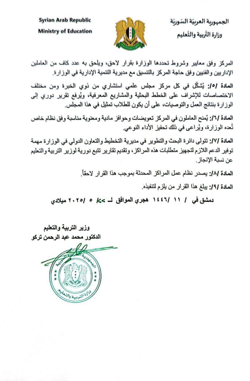 المادة /1/ تتولى كل مديرية تربية وتعليم في المحافظات تخصيص مقر مناسب للمركز البحثي وتجهيزه بكافة المستلزمات التقنية والمكتبية اللازمة، وتكليف كادر إشرافي متخصص لإدارة