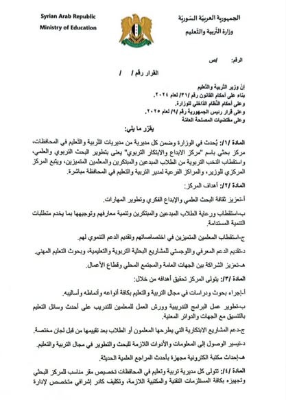المادة /1/ يحدث في الوزارة وضمن كل مديرية من مديريات التربية والتعليم في المحافظات مركز بحثي باسم مركز الابداع والابتكار التربوي" يعنى بتطوير البحث التربوي والعلمي، واستقطاب النخب التربوية من الطلاب المبدعين والمبتكرين والمعلمين المتميزين، ويتبع المركز المركزي للوزير، والمراكز الفرعية لمدير التربية والتعليم في المحافظة مباشرة.