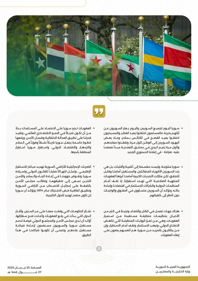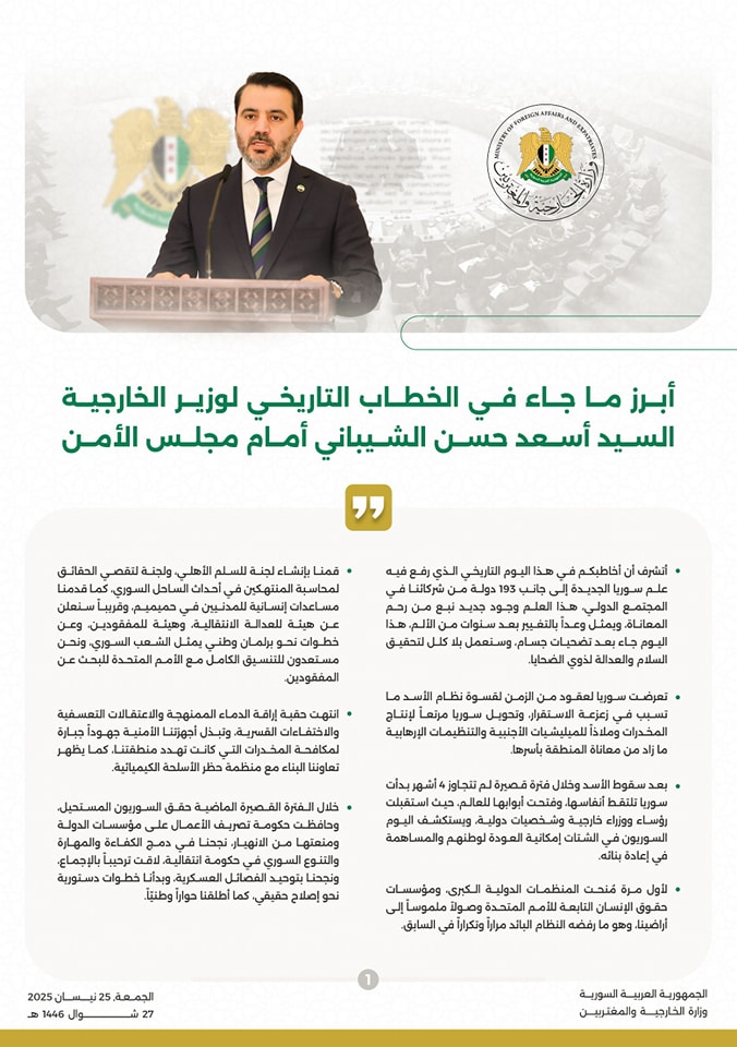 يشرفني أن أخاطب مجلس الأمن في هذا اليوم التاريخي، اليوم الذي رُفع فيه قبل خطابي هذا العلم الذي يمثل سورية الجديدة – سورية الحرية والكرامة – على سارية الأمم المتحدة، إلى جانب 192 دولة من شركائنا في المجتمع الدولي. أقدم تهانيّ الحارة لكل السوريين والسوريات على هذه اللحظة التاريخية. فهذا العلم ليس مجرد رمز، بل إعلان لوجود جديد ينبع من رحم المعاناة ويجسد مستقبلاً ينبثق من الصمود ووعداً بالتغيير بعد سنوات من الألم.