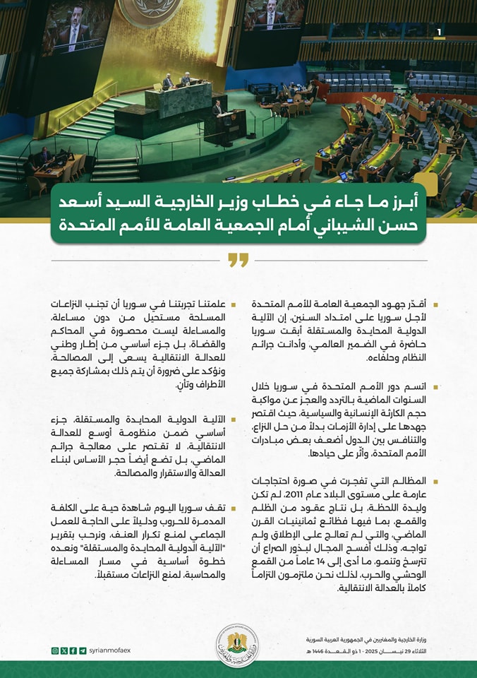 أبرز ما جاء في خطاب وزير الخارجية السيد أسعد حسن الشيباني أمام الجمعية العامة للأمم المتحدة