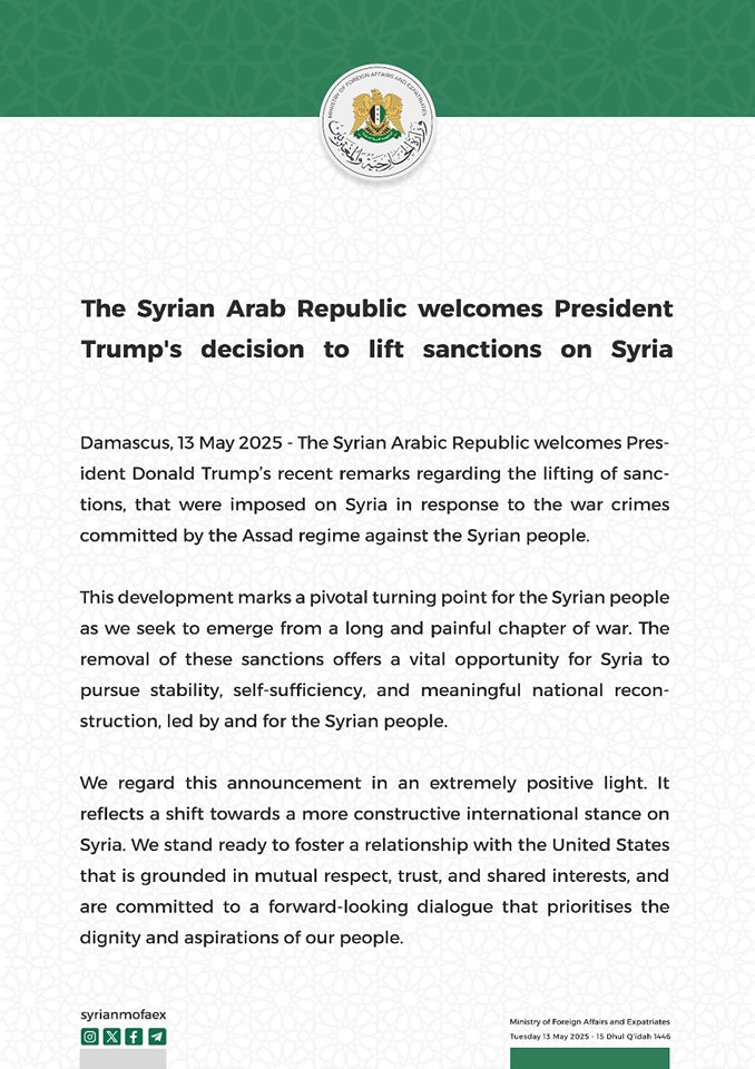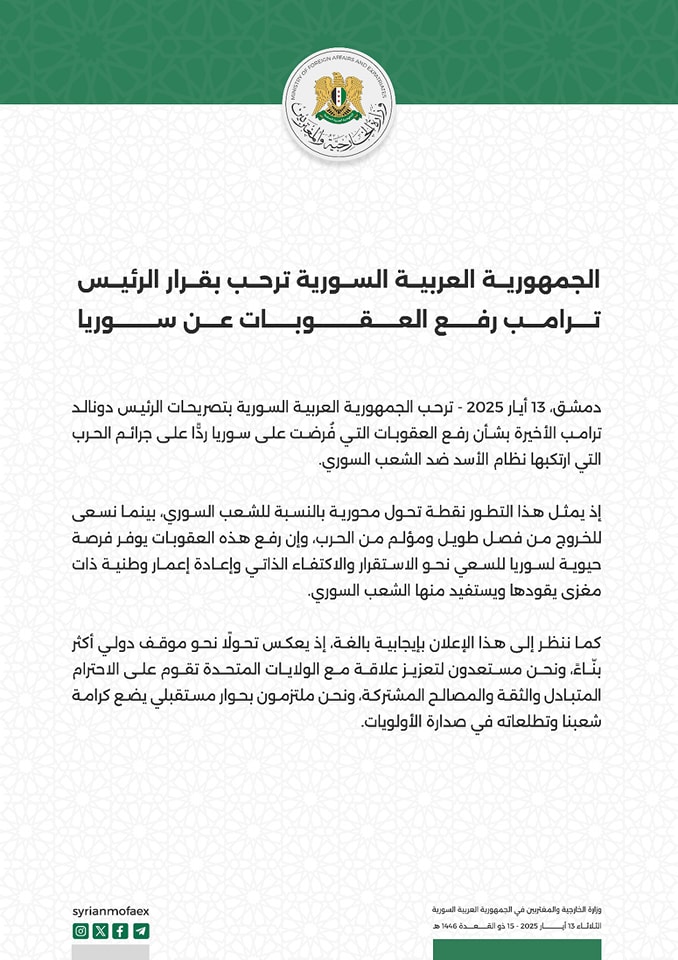 دمشق، 13 أيار 2025 - ترحب الجمهورية العربية السورية بتصريحات الرئيس دونالد ترامب الأخيرة بشأن رفع العقوبات التي فرضت على سوريا ردا على جرائم الحرب التي ارتكبها نظام الأسد ضد الشعب السوري.
