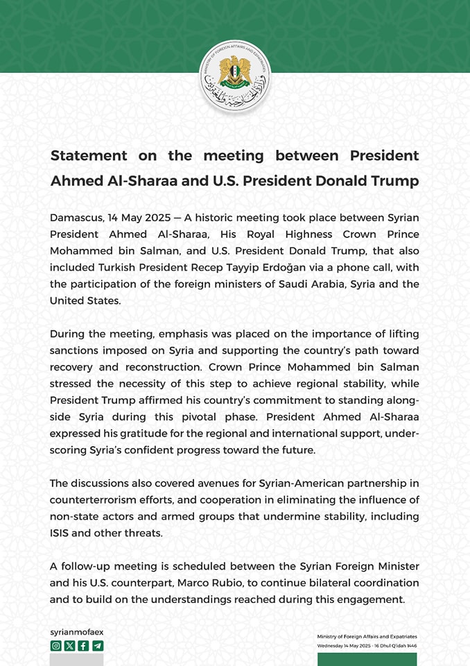بيان صادر عن وزارة الخارجية بشأن اللقاء بين رئيس الجمهورية السيد أحمد الشرع والرئيس الأمريكي السيد دونالد ترامب