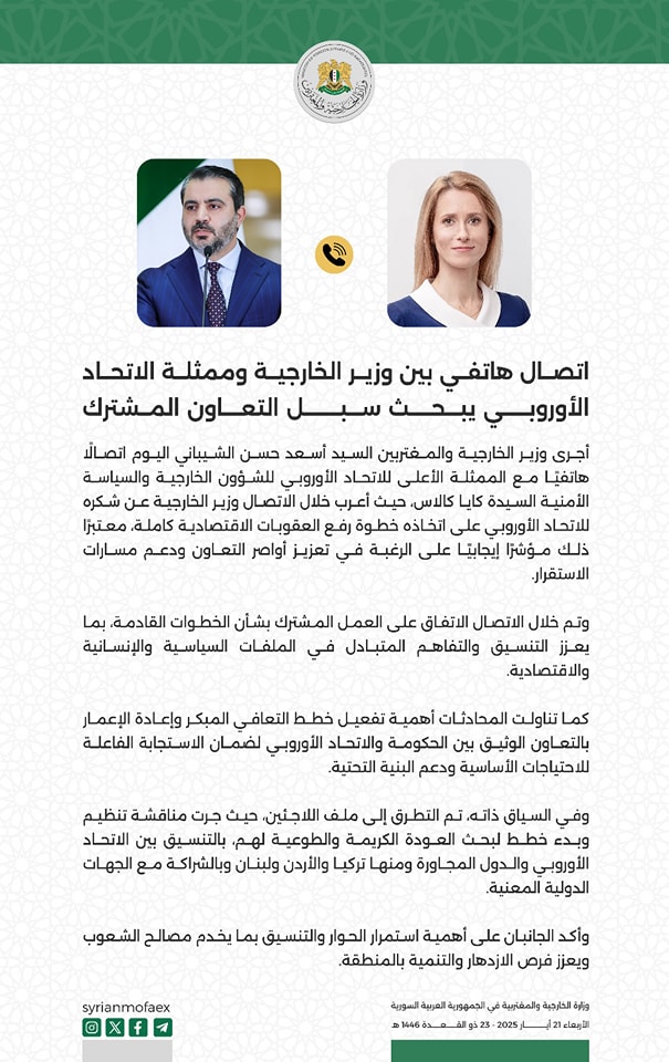 أجرى وزير الخارجية والمغتربين السيد أسعد حسن الشيباني اليوم اتصالا هاتفيا مع الممثلة الأعلى للاتحاد الأوروبي للشؤون الخارجية والسياسة الأمنية السيدة كايا كالاس، حيث أعرب خلال الاتصال وزير الخارجية عن شكره للاتحاد الأوروبي على اتخاذه خطوة رفع العقوبات الاقتصادية كاملة، معتبرا ذلك مؤشرًا إيجابيا على الرغبة في تعزيز أواصر التعاون ودعم مسارات الاستقرار.