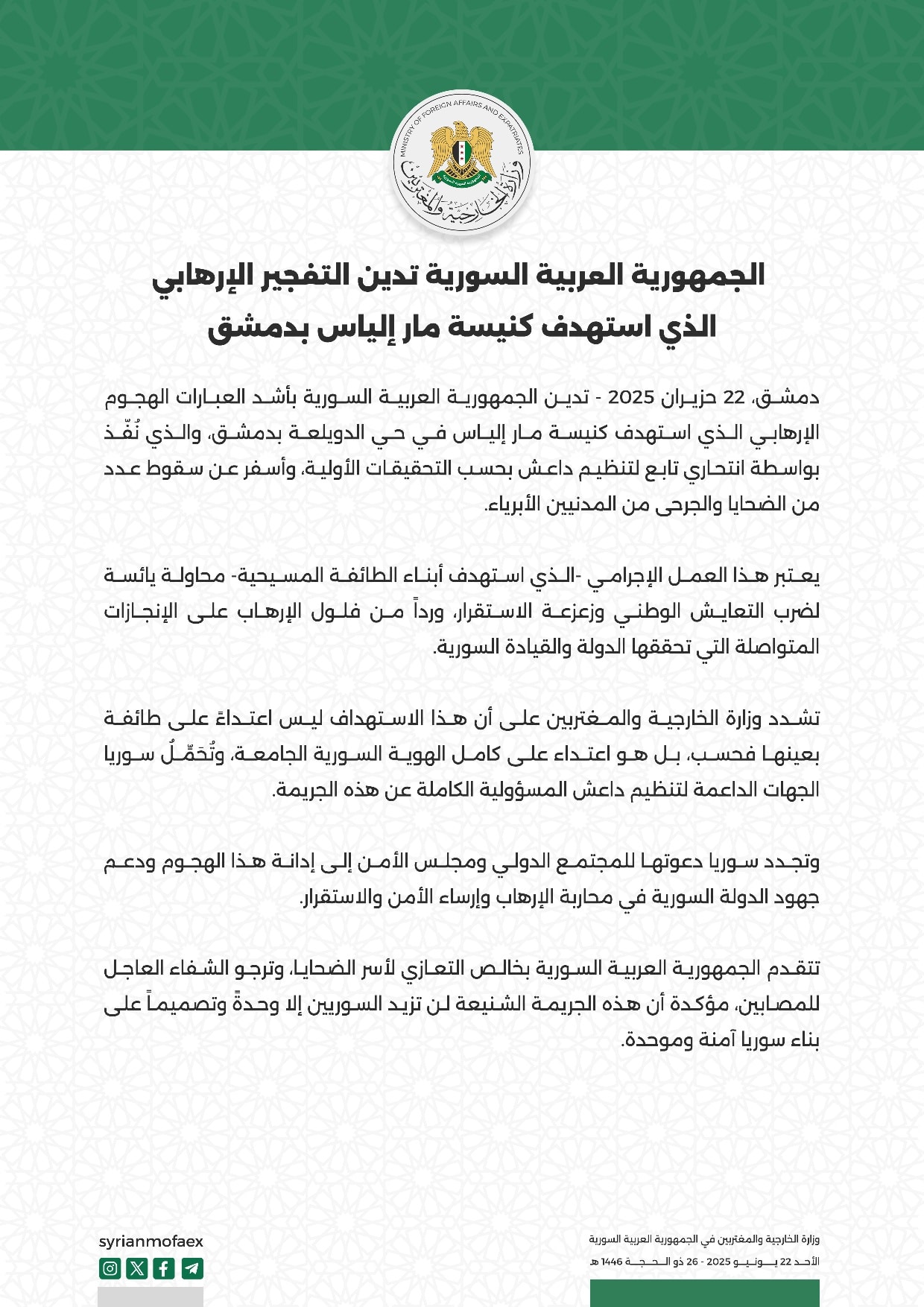 دمشق 22 حزيران 2025 - تدين الجمهورية العربية السورية بأشد العبارات الهجوم الإرهابي الذي استهدف كنيسة مار إلياس في حي الدويلعة بدمشق، والذي نفذ بواسطة انتحاري تابع لتنظيم داعش بحسب التحقيقات الأولية، وأسفر عن سقوط عدد من الضحايا والجرحى من المدنيين الأبرياء.