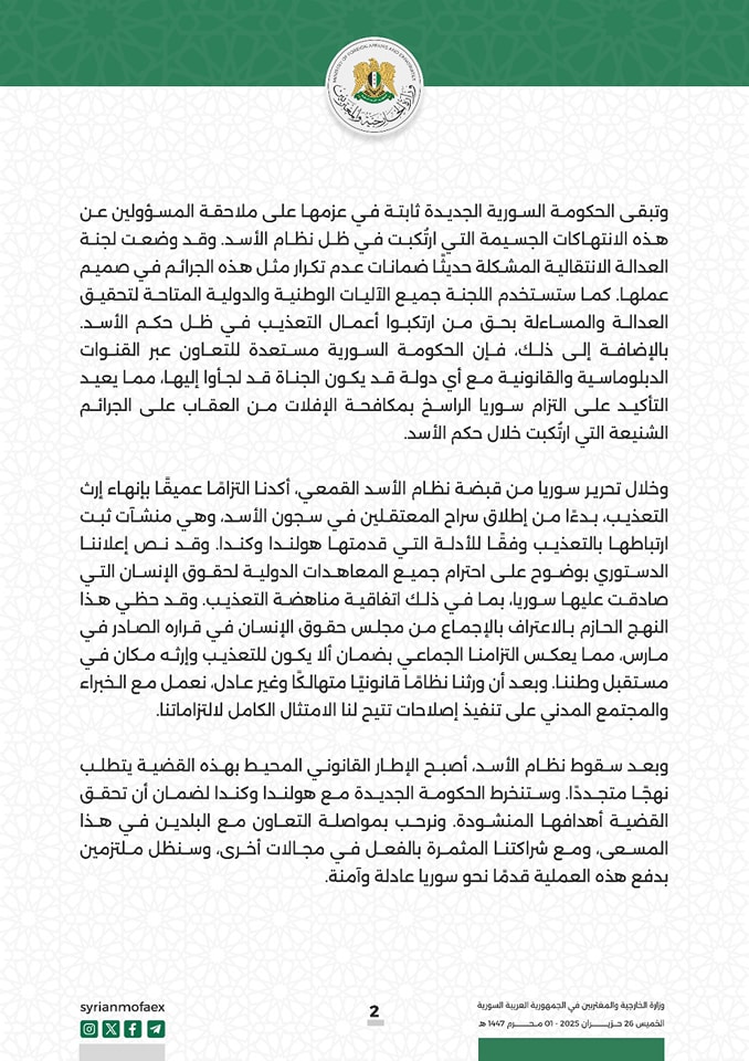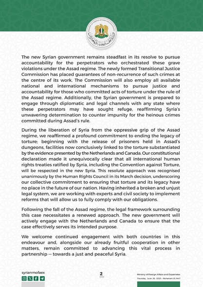 ترحب وزارة الخارجية والمغتربين السورية بالجهود الحثيثة التي تبذلها كل من هولندا وكندا أمام محكمة العدل الدولية من خلال المذكرة المقدمة في القضية المتعلقة بتطبيق اتفاقية مناهضة التعذيب وغيره من ضروب المعاملة أو العقوبة القاسية أو اللاإنسانية أو المهينة، والتي توثق الجرائم الفظيعة للتعذيب الجماعي التي ارتكبها نظام الأسد. ونظرًا لتغير السياق السياسي والقانوني الذي تستند إليه هذه القضية بعد سقوط نظام الأسد، فإن الحكومة الجديدة ستعمل بتعاون وثيق مع هولندا وكندا لضمان تحقيق أهداف هذه القضية.