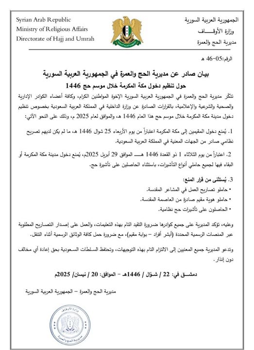 بيان صادر عن مديرية الحج والعمرة في الجمهورية العربية السورية حول تنظيم دخول مكة المكرمة خلال موسم حج 1446