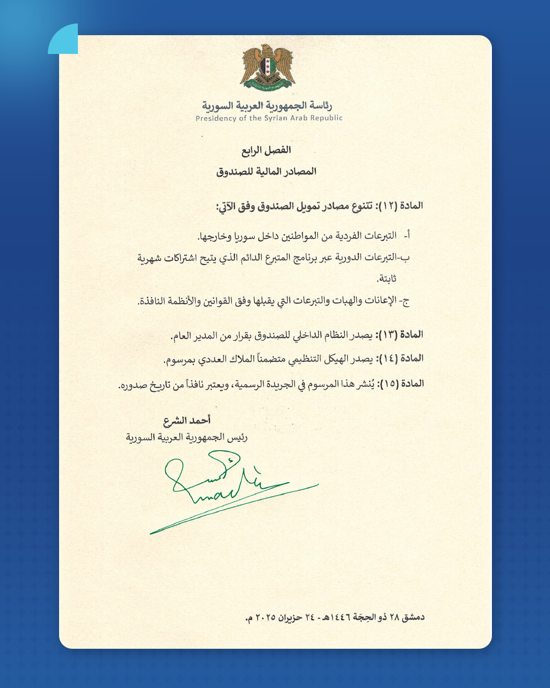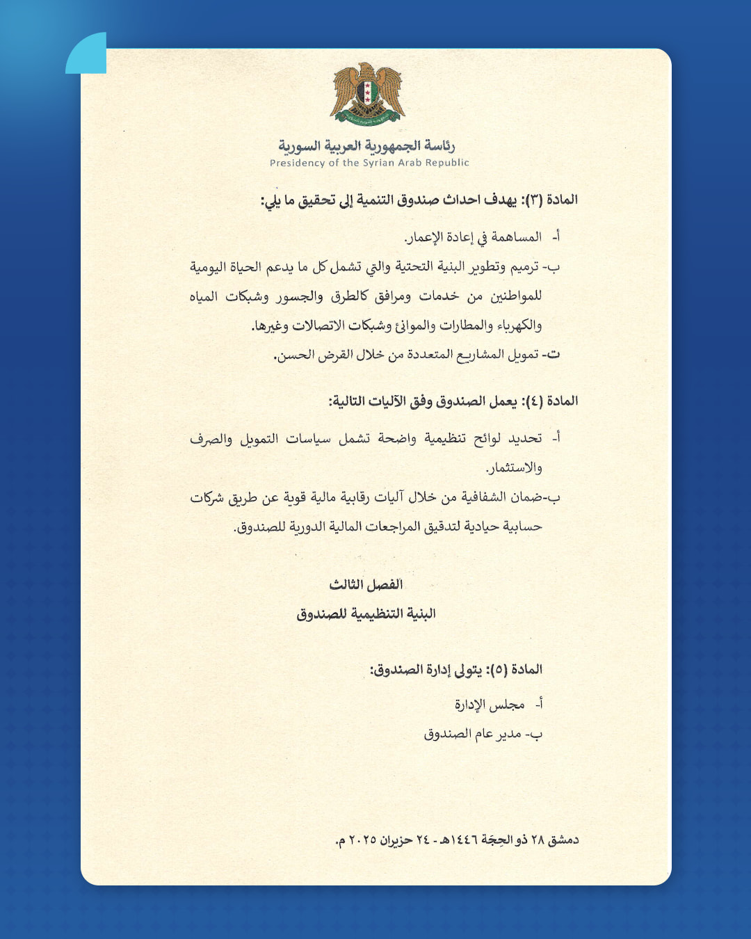 الرئيس أحمد الشرع يصدر المرسوم رقم 112 لعام 2025 القاضي بإحداث صندوق التنمية