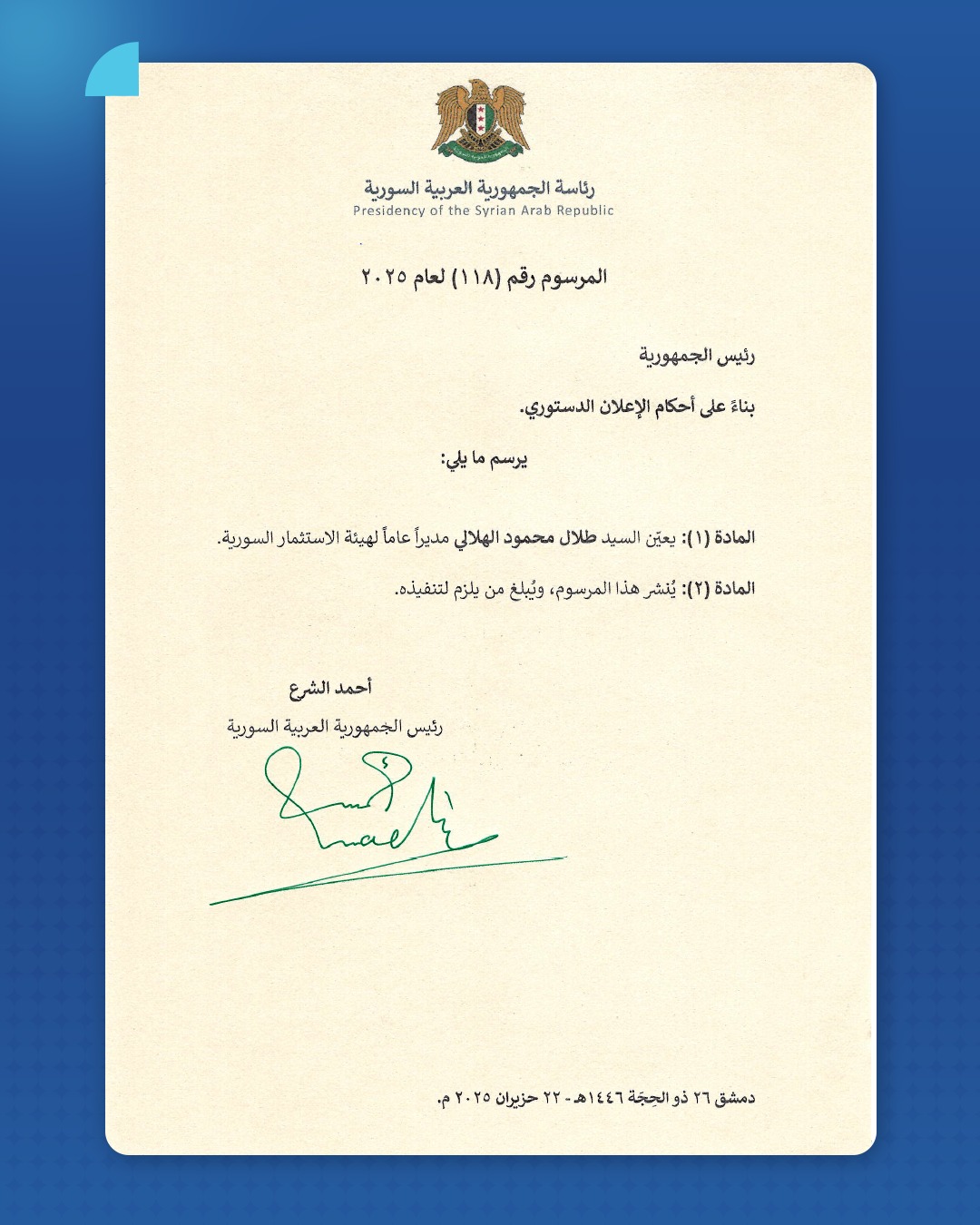 المرسوم رقم 118 لعام 2025 القاضي بتعيين السيد طلال محمود الهلالي مديراً عاماً لهيئة الاستثمار السورية
