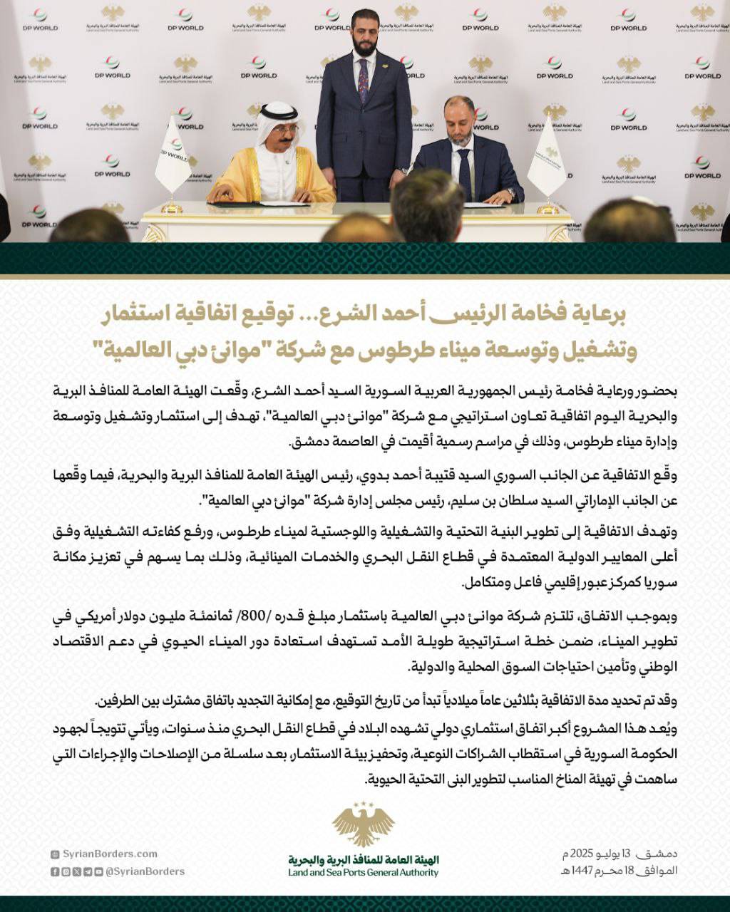 بحضور ورعاية فخامة رئيس الجمهورية العربية السورية السيد أحمد الشرع، وقعت الهيئة العامة للمنافذ البرية والبحرية اليوم اتفاقية تعاون استراتيجي مع شركة "موانئ دبي العالمية"، تهدف إلى استثمار وتشغيل وتوسعة وإدارة ميناء طرطوس، وذلك في مراسم رسمية أقيمت في العاصمة دمشق.