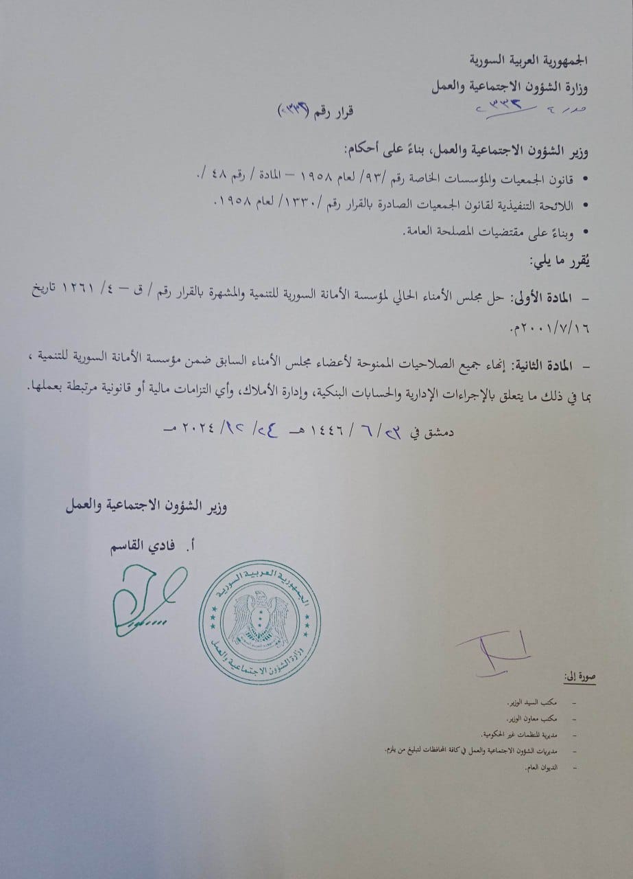 قرار وزارة الشؤون الاجتماعية والعمل رقم 332: حل مجلس الأمناء الحالي لمؤسسة الأمانة السورية للتنمية