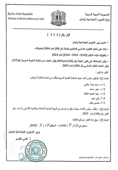 قرار وزارة الشؤون الاجتماعية والعمل رقم 125: تشكيل مجلس أمناء جديد لمنظمة التنمية السورية