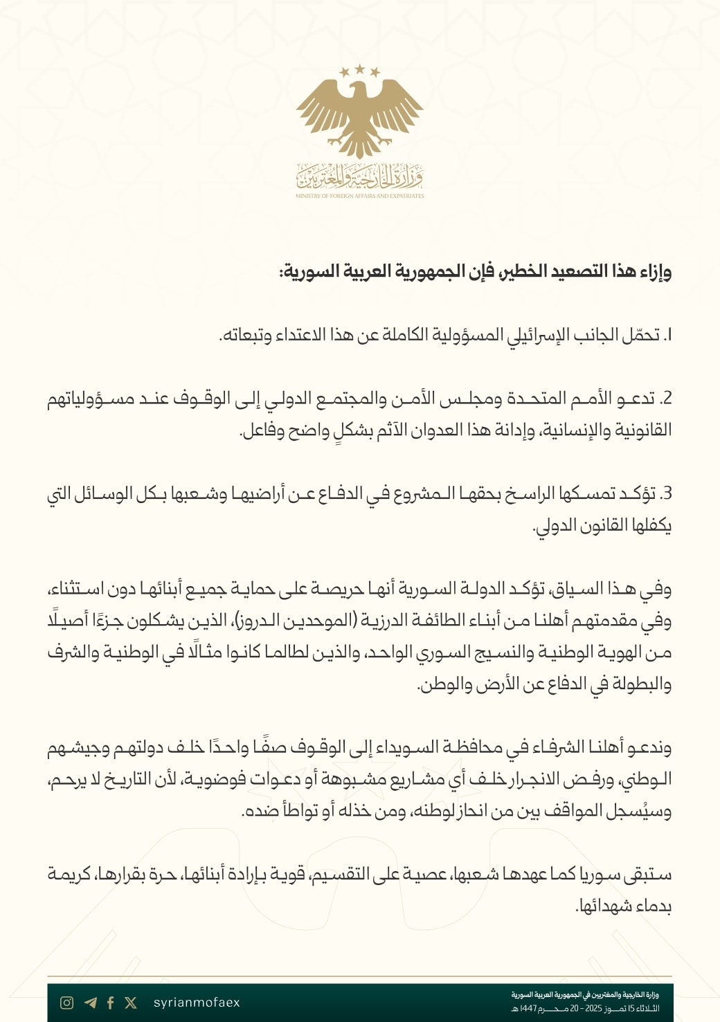 وفي هذا السياق، تؤكد الدولة السورية أنها حريصة على حماية جميع أبنائها دون استثناء، وفي مقدمتهم أهلنا من أبناء الطائفة الدرزية (الموحدين الدروز)، الذين يشكلون جزءًا أصيلا من الهوية الوطنية والنسيج السوري الواحد، والذين لطالما كانوا مثالا في الوطنية والشرف والبطولة في الدفاع عن الأرض والوطن.