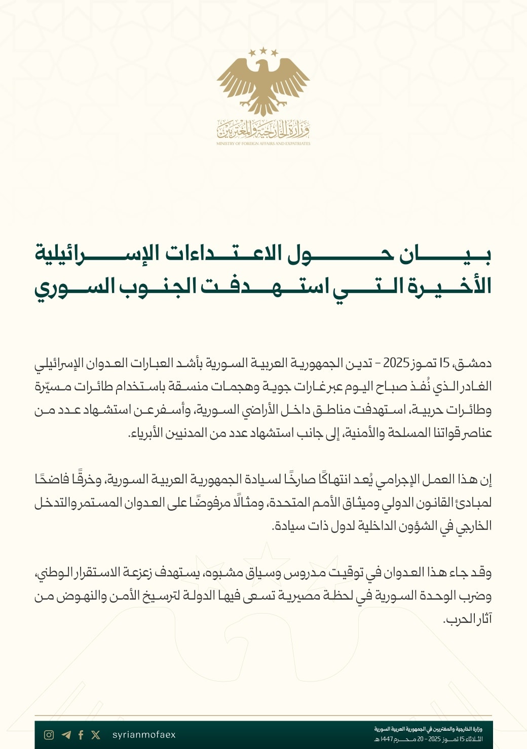 دمشق، 15 تموز 2025 - تدين الجمهورية العربية السورية بأشد العبارات العدوان الإسرائيلي الغادر الذي نفذ صباح اليوم عبر غارات جوية وهجمات منسقة باستخدام طائرات مسيرة وطائرات حربية، استهدفت مناطق داخل الأراضي السورية، وأسفر عن استشهاد عدد من عناصر قواتنا المسلحة والأمنية، إلى جانب استشهاد عدد من المدنيين الأبرياء.