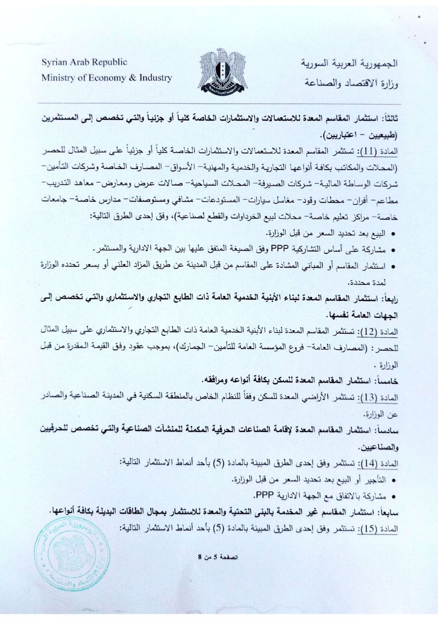 المادة (11) تستثمر المقاسم المعدة للاستعمالات والاستثمارات الخاصة كلياً أو جزئياً على سبيل المثال للحصر (المحلات والمكاتب بكافة أنواعها التجارية والخدمية والمهنية - الأسواق - المصارف الخاصة وشركات التأمين -شركات الوساطة المالية - شركات الصيرفة - المحلات السياحية - صالات عرض ومعارض - معاهد التدريب -مطاعم - أفران - محطات وقود مغاسل سيارات - المستودعات - مشافي ومستوصفات - مدارس خاصة - جامعات خاصة - مراكز تعليم خاصة - محلات لبيع الخرداوات والقطع الصناعية، وفق إحدى الطرق التالية: