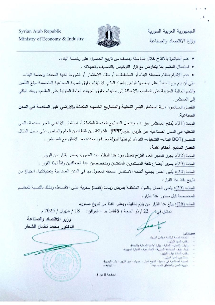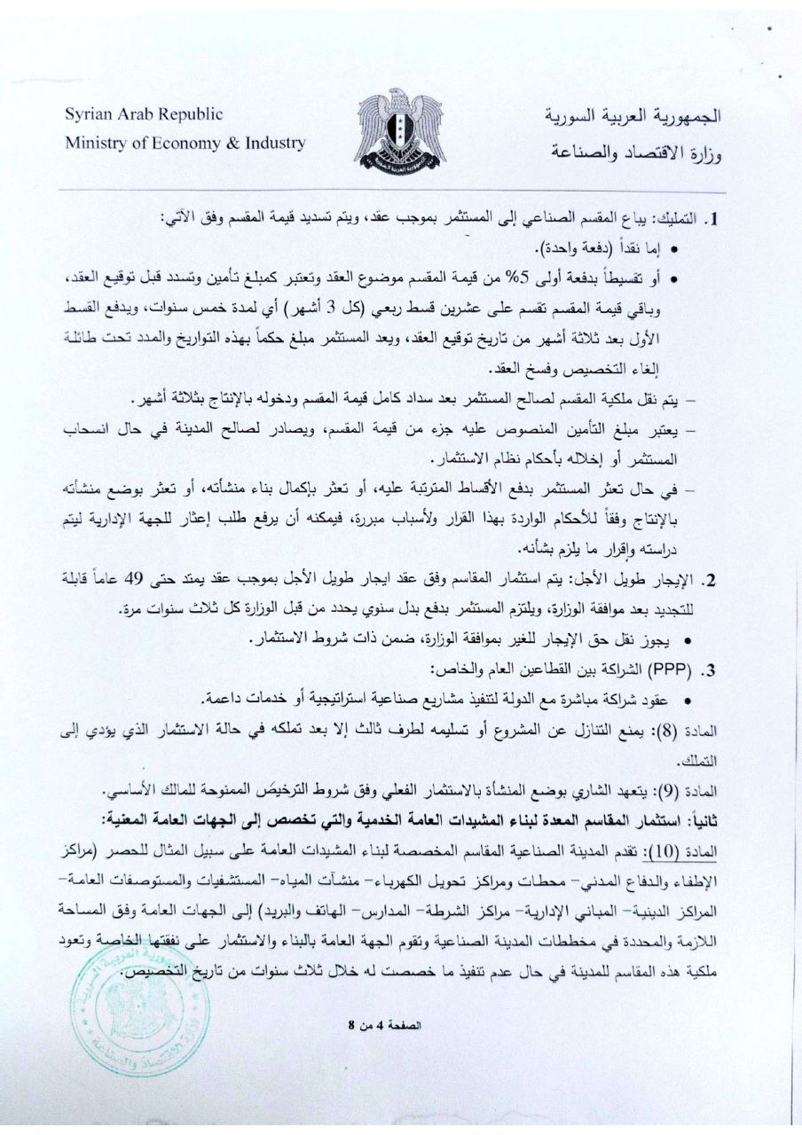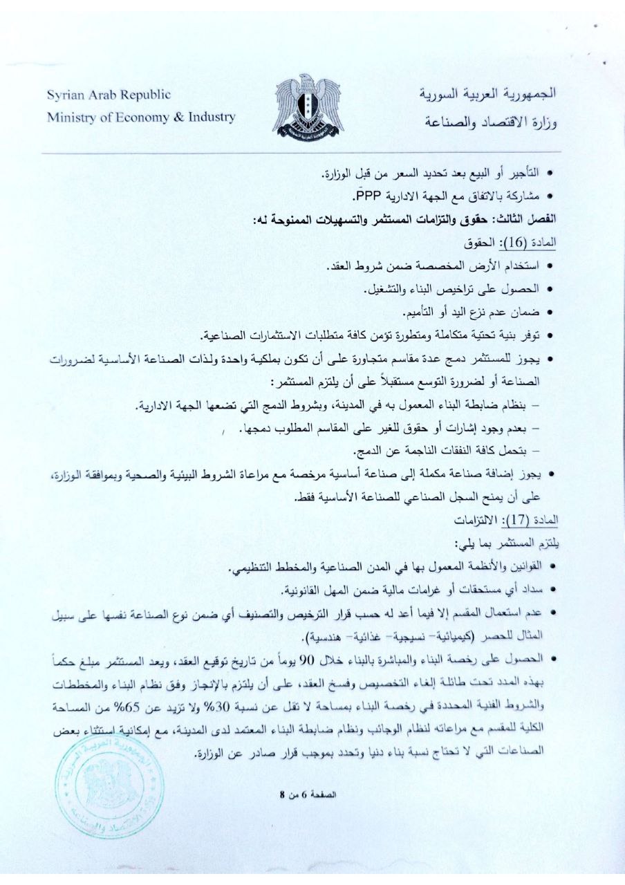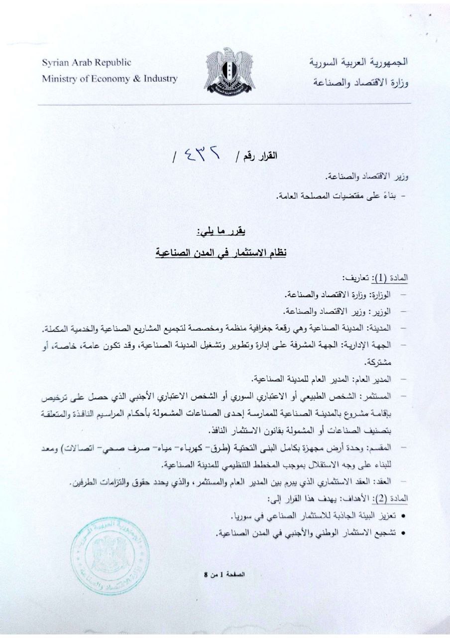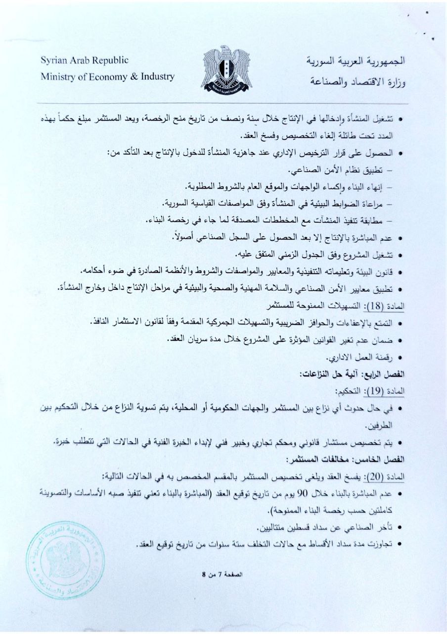 . تعزيز البيئة الجاذبة للاستثمار الصناعي في سوريا.