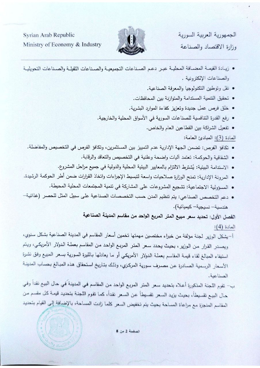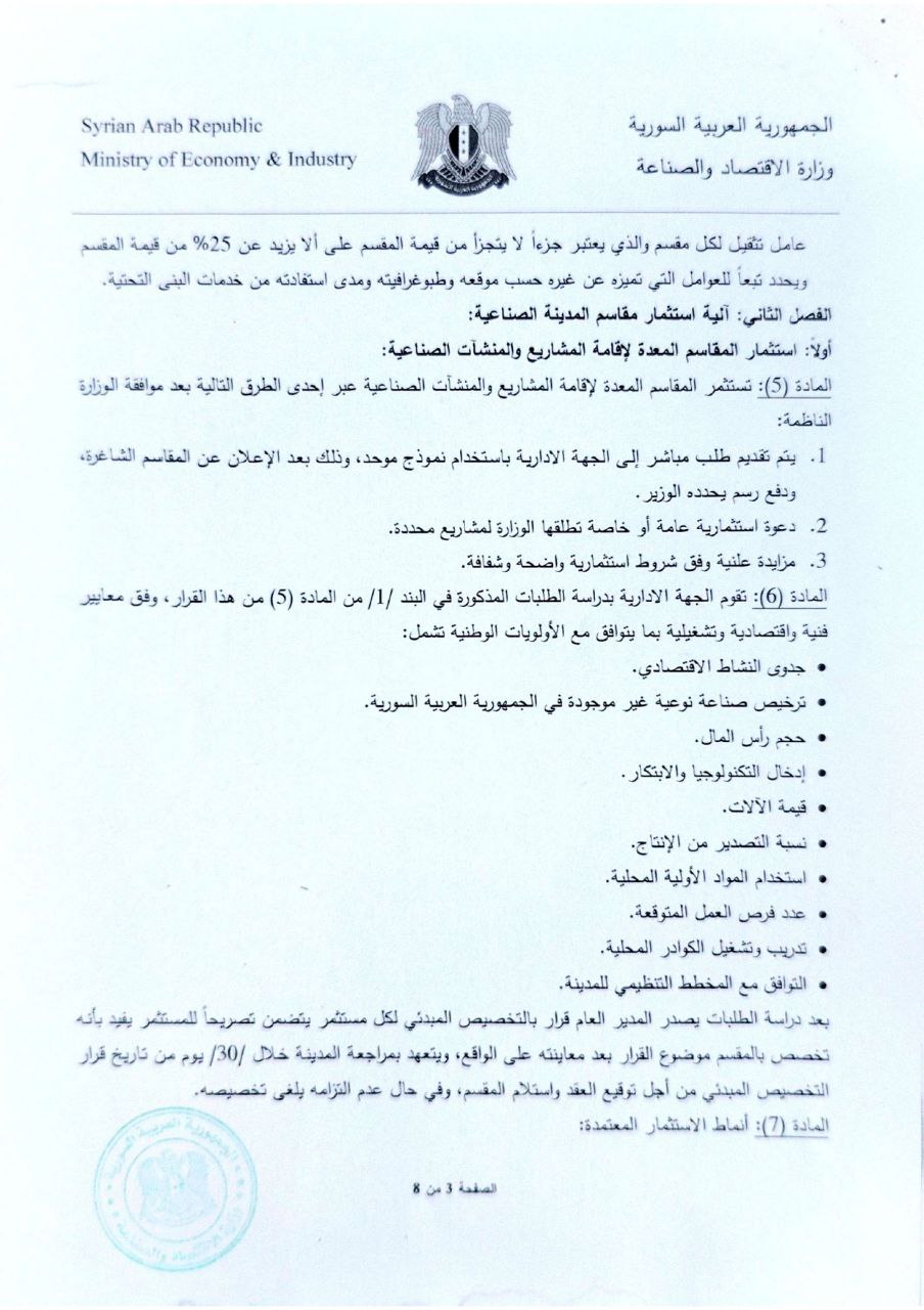 أ - يشكل الوزير لجنة مؤلفة من خبراء مختصين مهمتها تخمين أسعار المقاسم في المدينة الصناعية بشكل سنوي، ويصدر القرار من الوزير، بحيث يحدد سعر المتر المربع الواحد من المقاسم بعملة الدولار الأمريكي، ويتم استيفاء المبالغ لقاء قيمة المقاسم بعملة الدولار الأمريكي أو ما يعادلها بالليرة السورية بسعر المبيع وفق نشرة الأسعار الرسمية الصادرة عن مصرف سورية المركزي، وذلك بتاريخ استحقاق هذه المبالغ بحساب المدينة الصناعية.