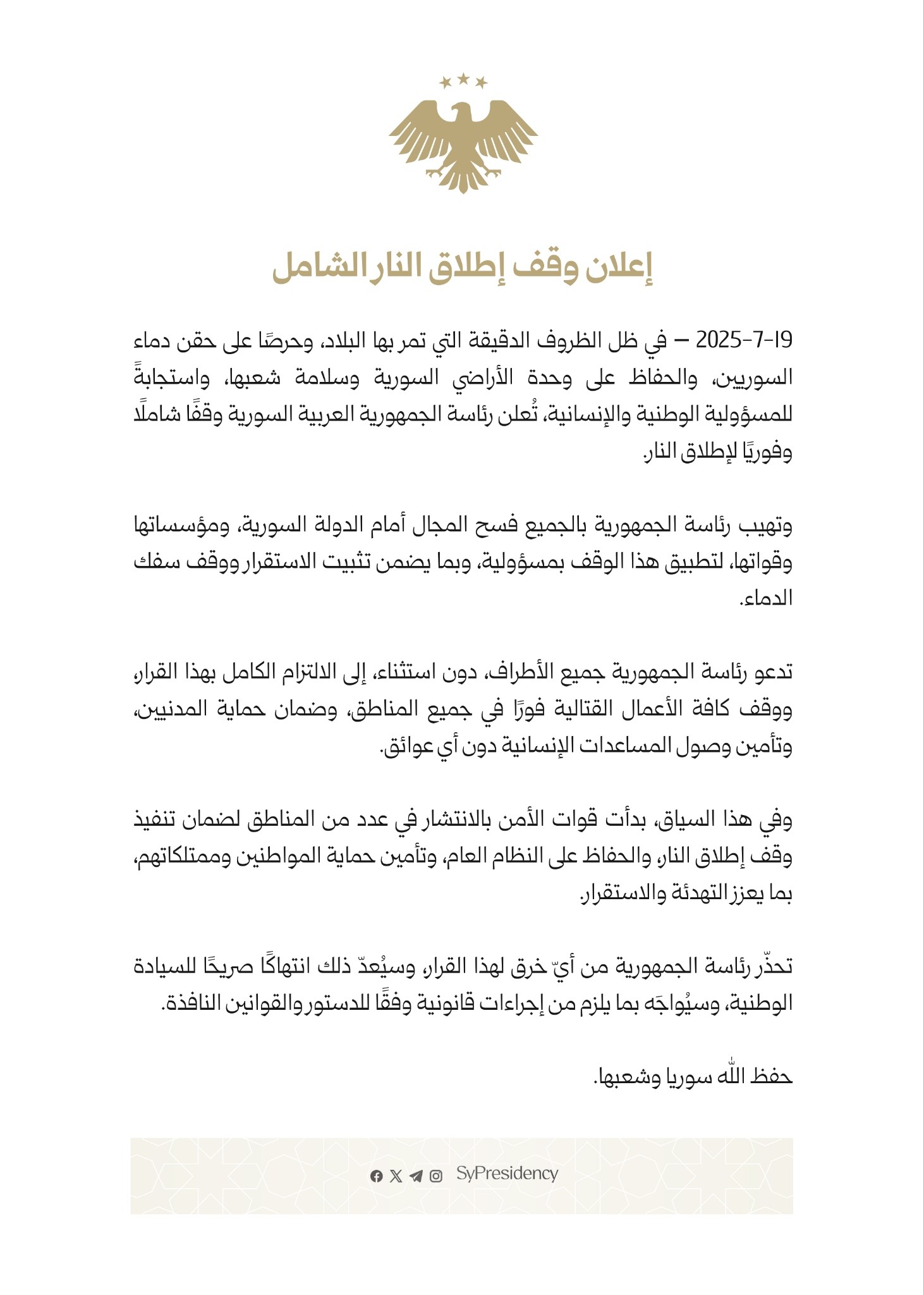 2025-7-19 - في ظل الظروف الدقيقة التي تمر بها البلاد، وحرصا على حقن دماء السوريين، والحفاظ على وحدة الأراضي السورية وسلامة شعبها، واستجابةً للمسؤولية الوطنية والإنسانية، تُعلن رئاسة الجمهورية العربية السورية وقفًا شاملا وفوريا لإطلاق النار.