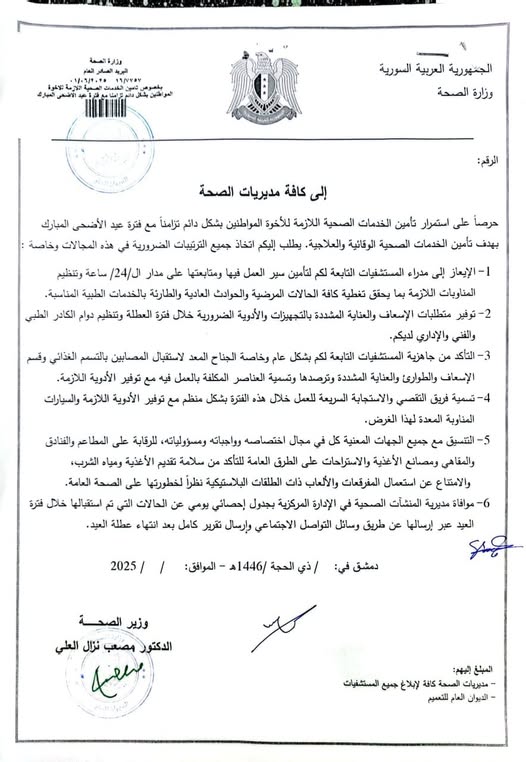 حرصاً على استمرار تأمين الخدمات الصحية اللازمة للأخوة المواطنين بشكل دائم تزامناً مع فترة عيد الأضحى المبارك بهدف تأمين الخدمات الصحية الوقائية والعلاجية. يطلب إليكم اتخاذ جميع الترتيبات الضرورية في هذه المجالات وخاصة :