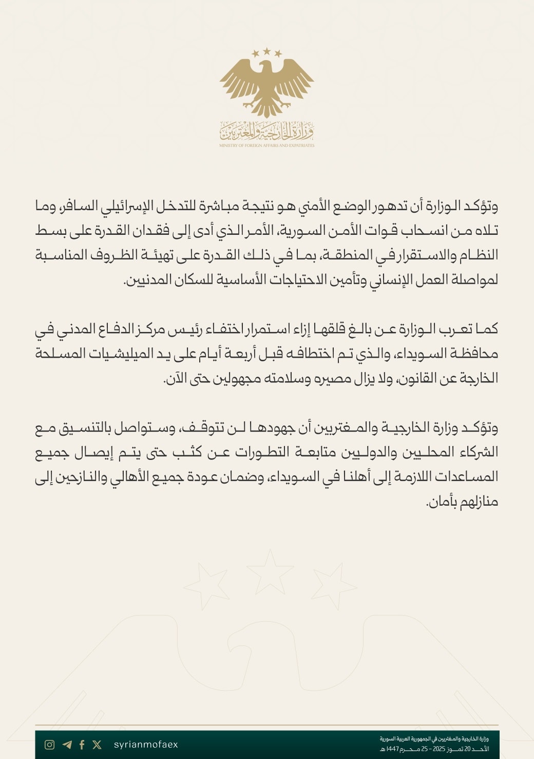 كما تعرب الوزارة عن بالغ قلقها إزاء استمرار اختفاء رئيس مركز الدفاع المدني في محافظة السويداء، والذي تم اختطافه قبل أربعة أيام على يد الميليشيات المسلحة الخارجة عن القانون، ولا يزال مصيره وسلامته مجهولين حتى الآن.