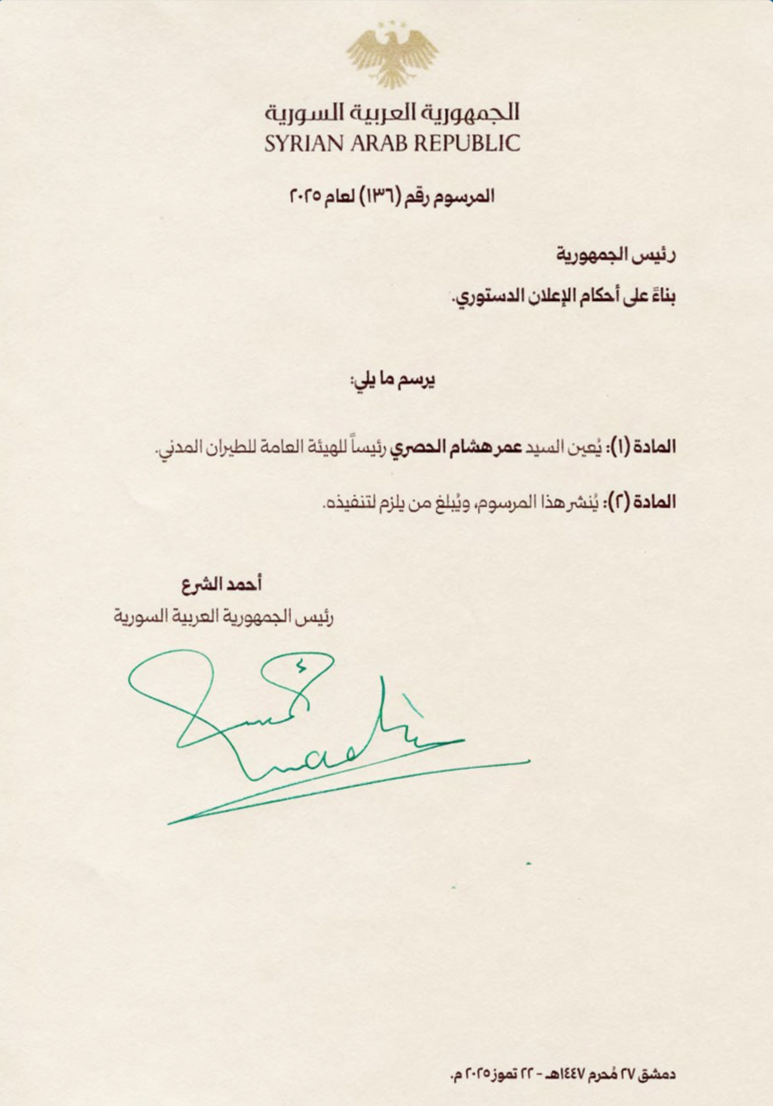 المرسوم 136 لعام 2025: تعيين عمر الحصري رئيسًا لهيئة الطيران المدني