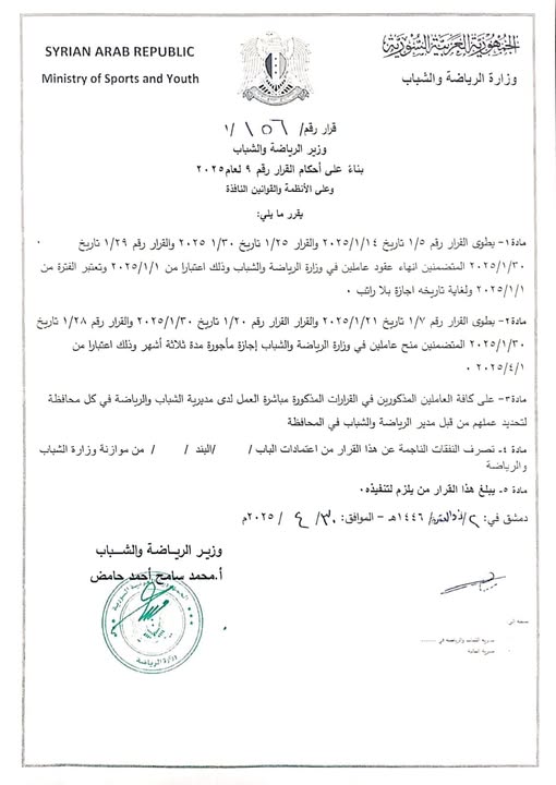 ٢٠٢٥/١/٣٠ المتضمنين انهاء عقود عاملين في وزارة الرياضة والشباب وذلك اعتبارا من ٢٠٢٥/١/١ وتعتبر الفترة من ٢٠٢٥/١/١ ولغاية تاريخه اجازة بلا راتب .