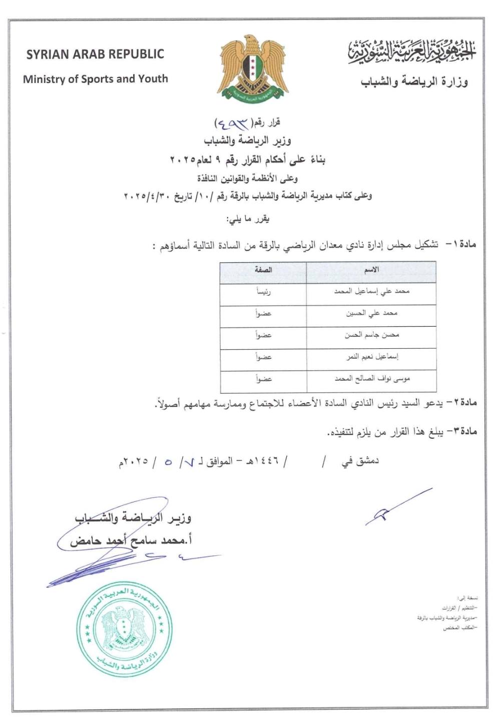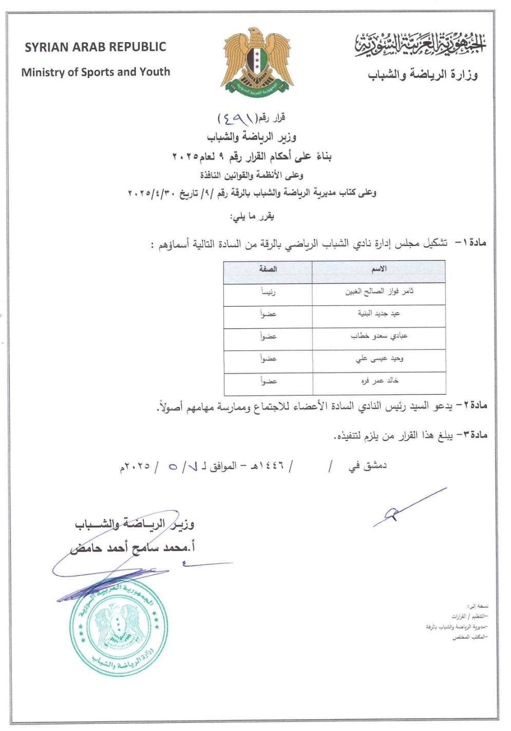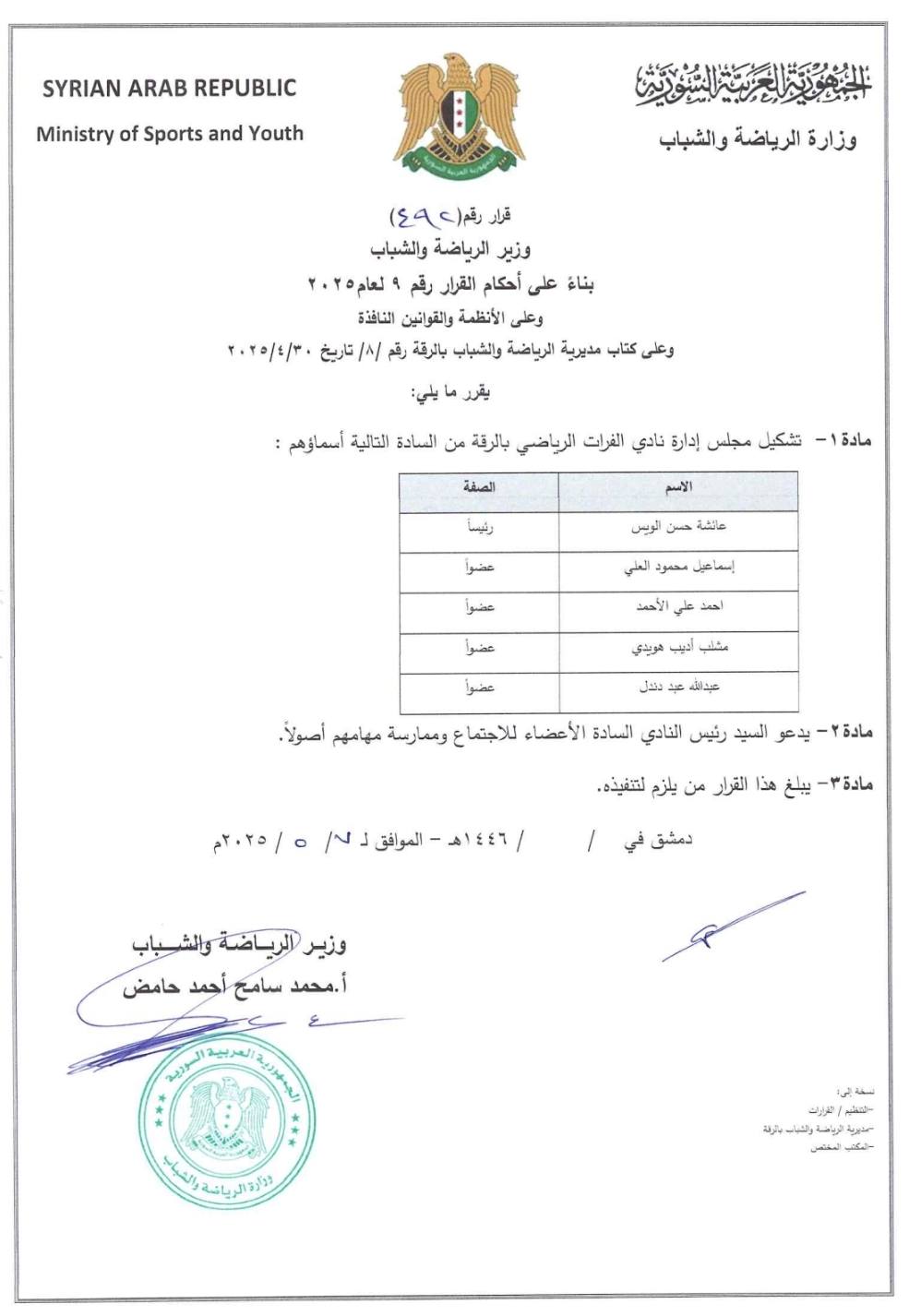 وزير الرياضة والشباب السوري يصدر قرارات بتشكيل مجالس إدارات لثلاثة أندية في الرقة