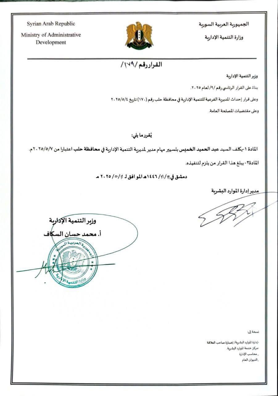 المادة 1 - يكلف السيد عبد الحميد الخميس بتسيير مهام مدير المديرية التنمية الإدارية في محافظة حلب اعتبارا من ٢٠٢٥/٥/٧م.