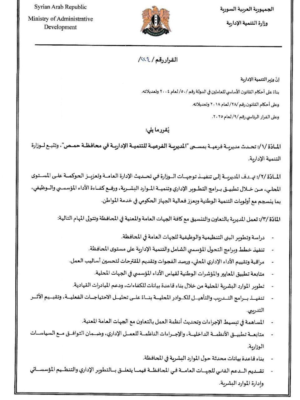 المادة / ١/: تحدث مديرية فرعية بمسمى المديرية الفرعية للتنمية الإدارية في محافظة حمص"، وتتبع لوزارة التنمية الإدارية.