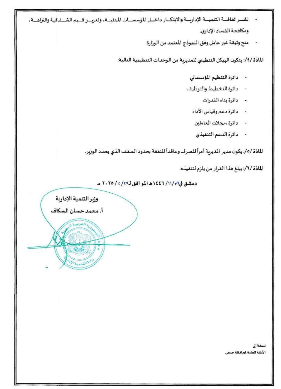وزارة التنمية الإدارية: قرار إحداث مديرية التنمية الإدارية في حمص