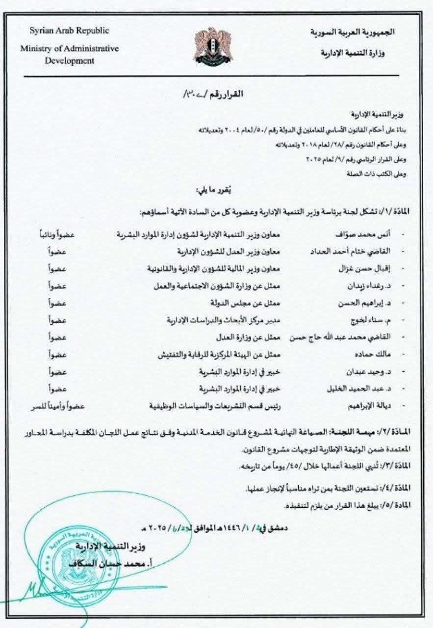 وزارة التنمية الإدارية: قرار تشكيل لجنة الصياغة النهائية لمشروع قانون الخدمة المدنية