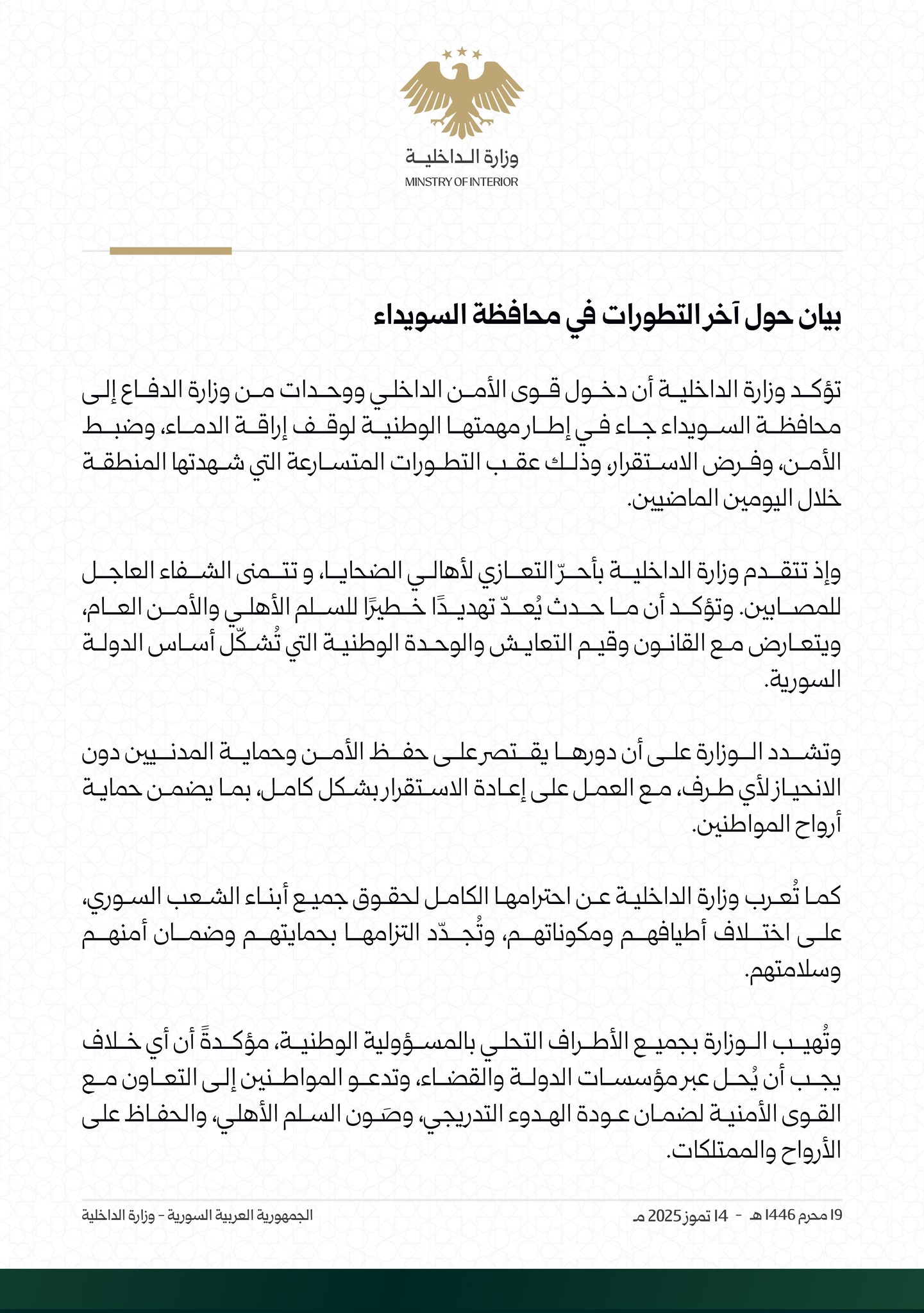 تؤكد وزارة الداخلية أن دخول قوى الأمن الداخلي ووحدات من وزارة الدفاع إلى محافظة السويداء جاء في إطار مهمتها الوطنية لوقف إراقة الدماء، وضبط الأمن، وفرض الاستقرار، وذلك عقب التطورات المتسارعة التي شهدتها المنطقة خلال اليومين الماضيين.