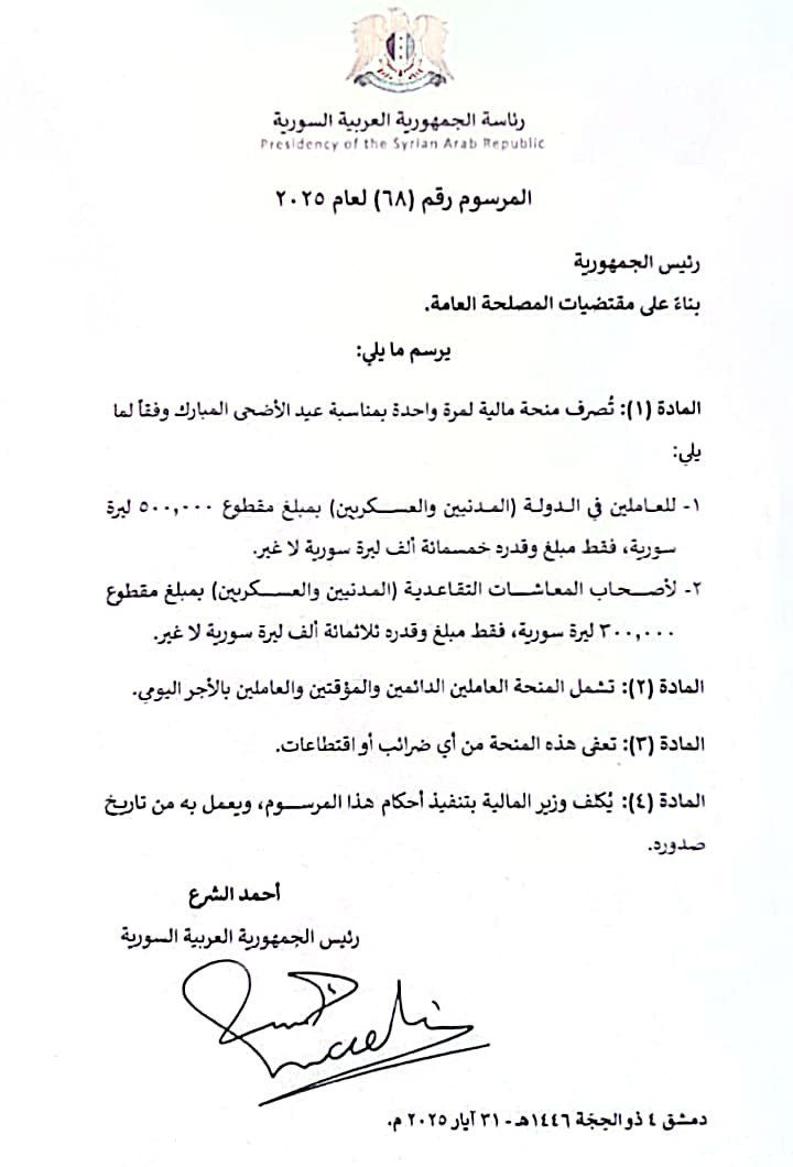 المرسوم 68 لعام 2025: صرف منحة مالية لمرة واحدة بمناسبة عيد الأضحى المبارك