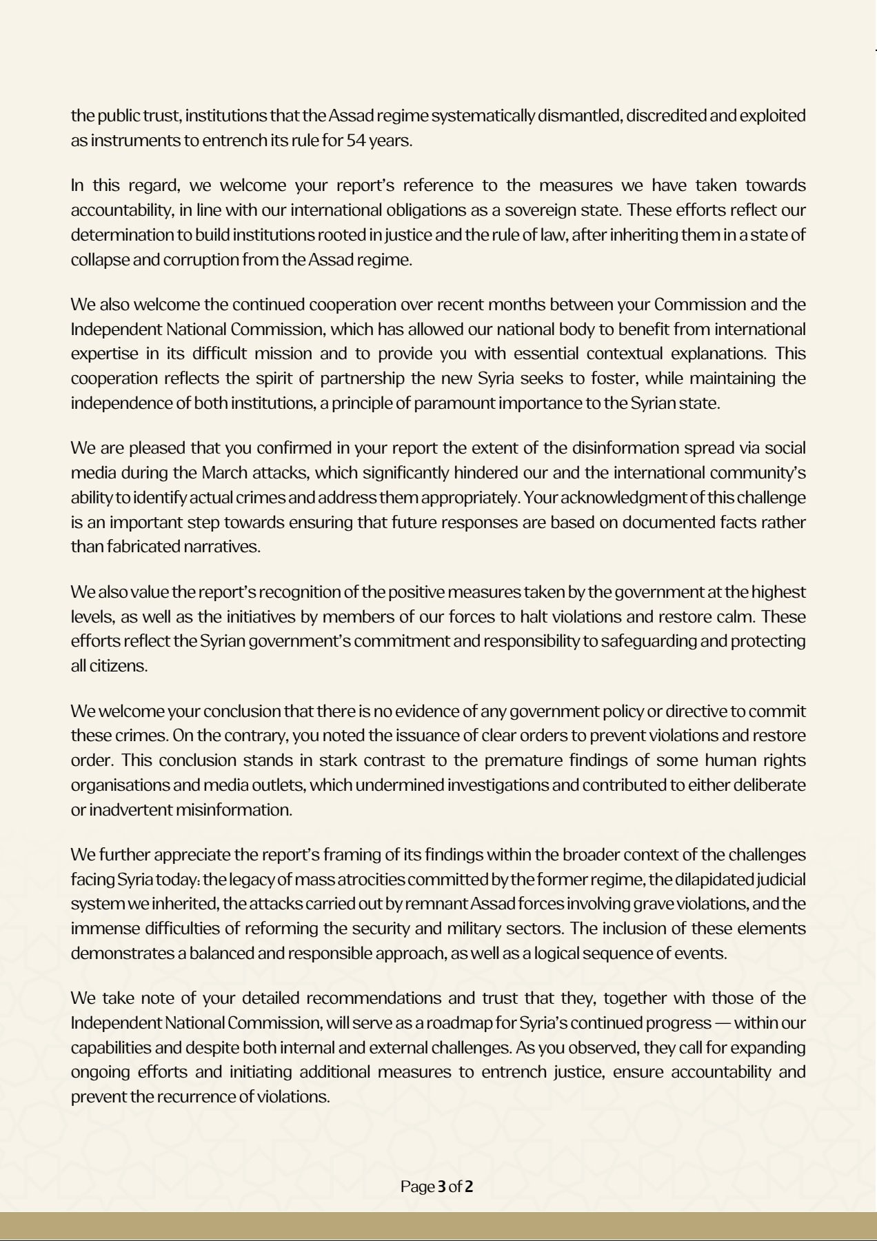 We further appreciate the report's framing of its findings within the broader context of the challenges facing Syria today: the legacy of mass atrocities committed by the former regime, the dilapidated judicial system we inherited, the attacks carried out by remnant Assad forces involving grave violations, and the immense difficulties of reforming the security and military sectors. The inclusion of these elements demonstrates a balanced and responsible approach, as well as a logical sequence of events.