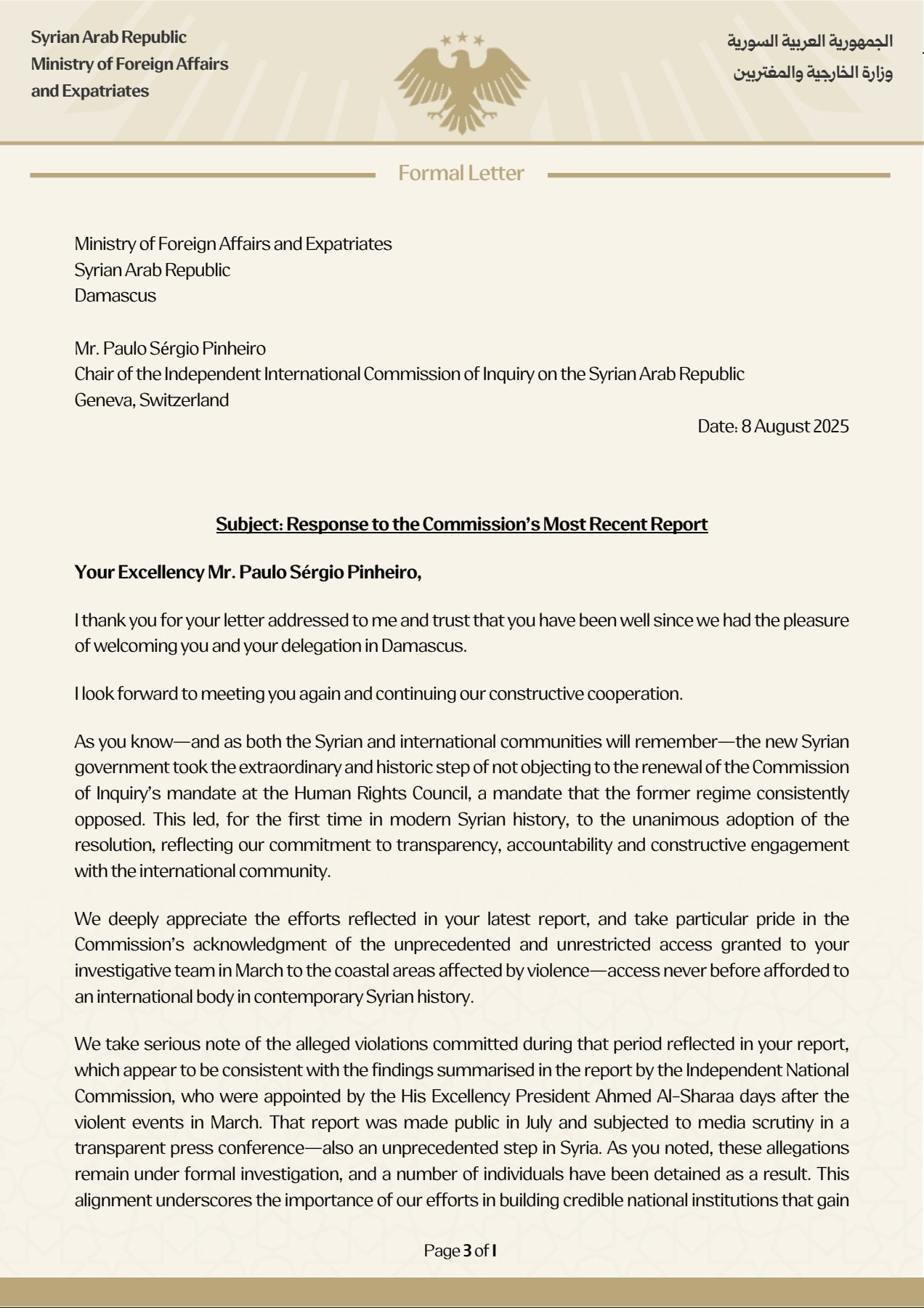 In conclusion, we reaffirm our commitment to constructive cooperation with your office and with the wider international community. We are confident that our future cooperation will remain grounded in mutual respect for Syria's sovereignty and territorial integrity.