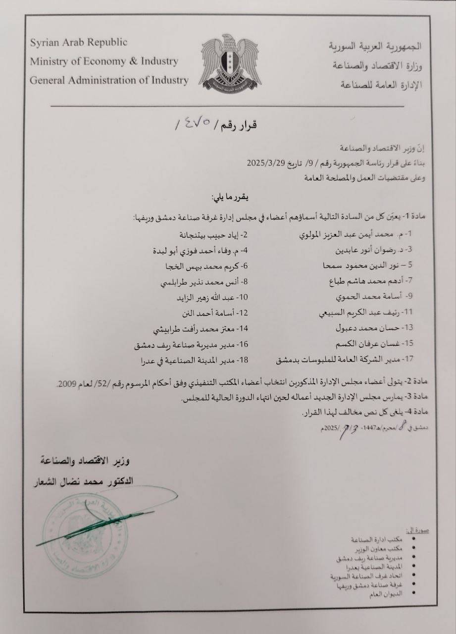 وزارة الاقتصاد والصناعة: قرار تعيين أعضاء غرفة صناعة دمشق وريفها