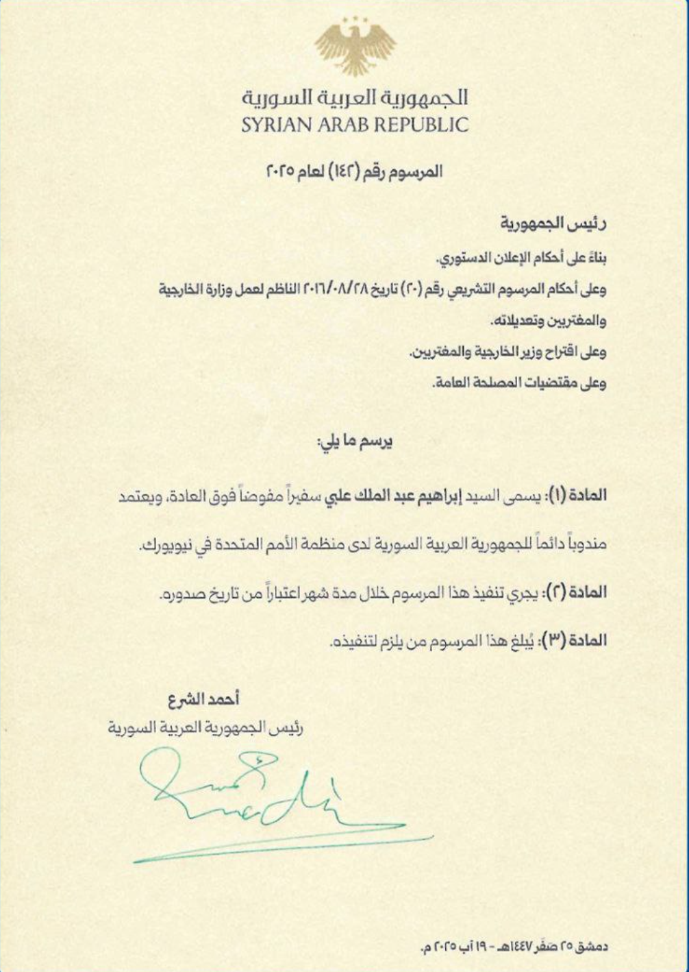 المرسوم 142 لعام 2025: تعيين ابراهيم العلبي سفيرًا مفوضًا فوق العادة لدى الأمم المتحدة