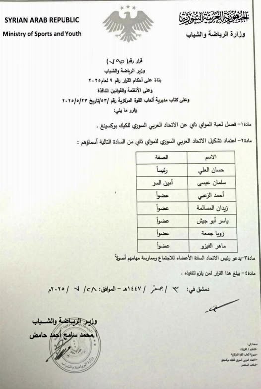 مادة ٢ - اعتماد تشكيل الاتحاد العربي السوري للمواي تاي من السادة التالية أسماؤهم :
