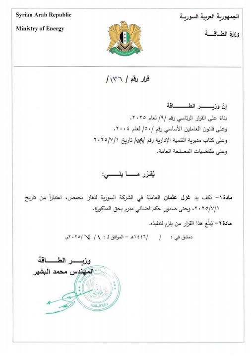 مادة 1 - يكف يد غزل عثمان العاملة في الشركة السورية للغاز بحمص، اعتباراً من تاريخ ٢٠٢٥/٧/١ ، وحتى صدور حكم قضائي مبرم بحق المذكورة.