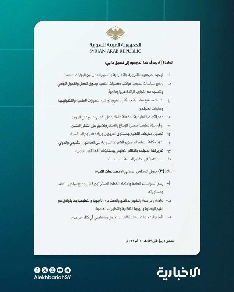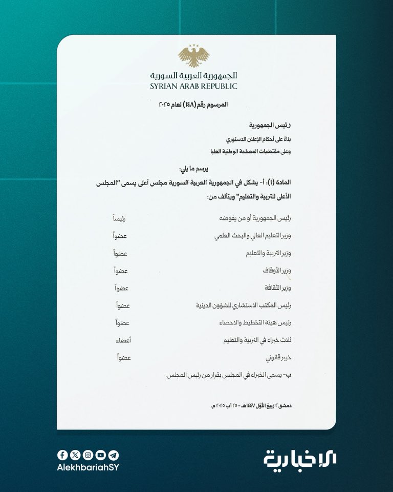 السيد الرئيس أحمد الشرع يصدر المرسوم رقم (148) لعام 2025 القاضي بتشكيل المجلس الأعلى للتربية والتعليم