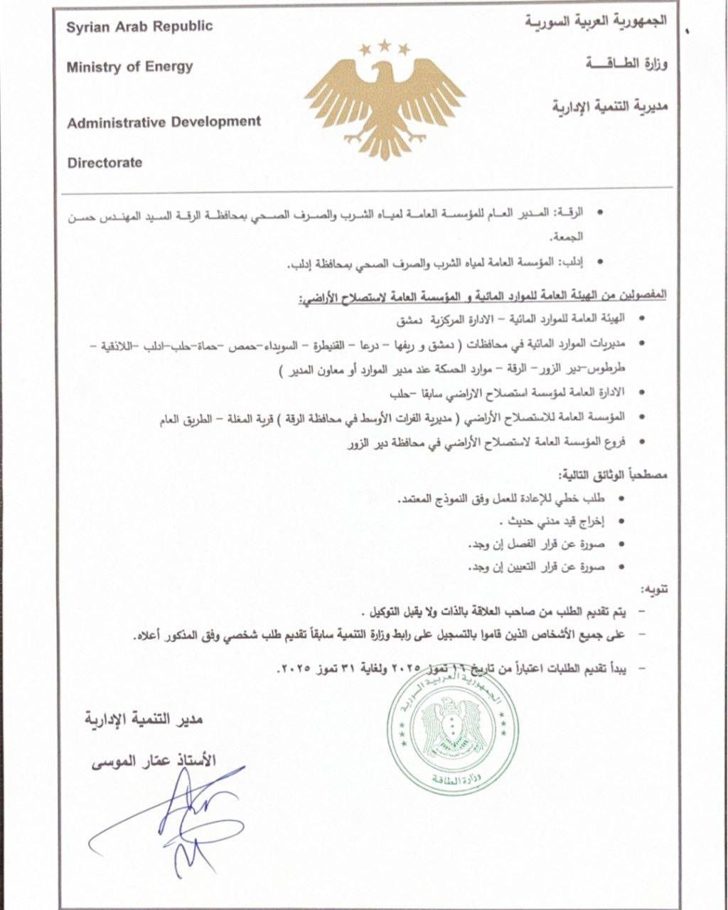 تعلن مديرية التنمية الإدارية في وزارة الطاقة عن إعادة فتح باب استقبال طلبات الإعادة للعمل للسادة العاملين المفصولين الأسباب تتعلق بالثورة السورية المباركة أو الخدمة العسكرية في كل من وزارة الموارد المائية سابقاً - الهيئة العامة للموارد المائية و المؤسسة العامة لاستصلاح الأراضي بما فيهم الأشخاص الذين بلغوا سن التقاعد بتاريخ تقديم الطلب.