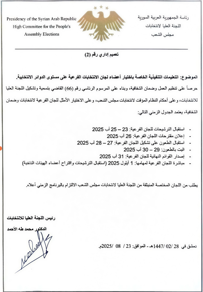 اللجنة العليا لانتخابات مجلس الشعب تصدر التعميم الإداري رقم 2 المتضمن التعليمات التنفيذية الخاصة باختيار أعضاء لجان الانتخابات الفرعية في المحافظات على مستوى الدوائر الانتخابية.